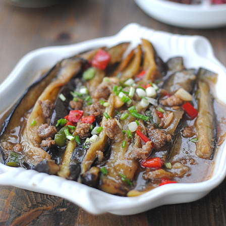 长茄子2个、猪肉糜100克、青红椒各1个、鸡蛋1个