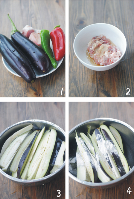 4、将茄条捞出沥干,拍上干淀粉。