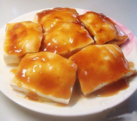 13.把烧好的酱汁浇到豆腐上即可,就可以吃了。