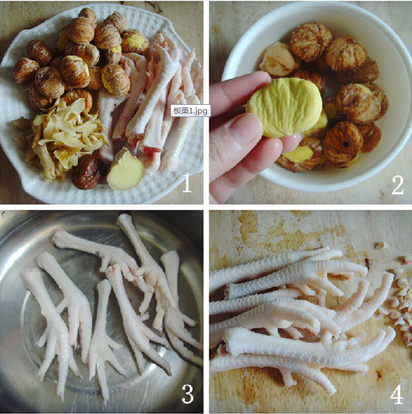 1.准备好所需材料:新鲜鸡脚半斤,板栗半斤,百合1两,生姜1小块(去皮拍扁),蜜枣1个。