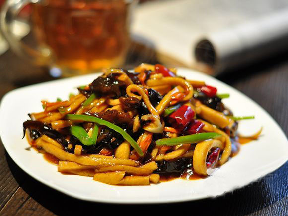7.起锅热油,把干红椒炒香,下豆腐丝煸炒片刻